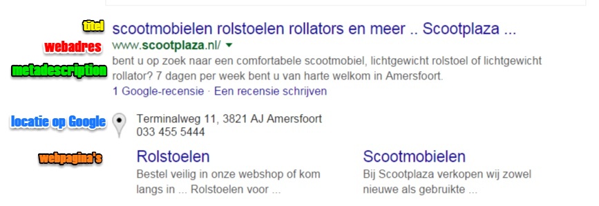 Daarnaast is de meta-description (samenvatting onder de website URL) erg belangrijk omdat deze korte omschrijving te zien is in de zoekresultaten en de online surfer naar een scootmobiel, op basis daarvan, beslist of deze doorklikt naar je website. Het vormt een soort slogan waarmee je in eerste instantie de aandacht trekt van het online publiek.
