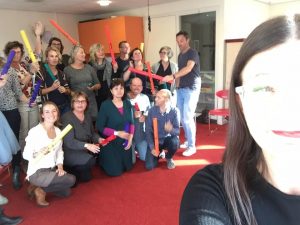 Het allermooiste van al die dopamine in je systeem komt hier tot bloei: in samenwerking met anderen. De verbindende werking van energie die door dopamine ontstaat is het allerbeste te ervaren als je met anderen samen iets doet. Sporten in een team bijvoorbeeld. Ook op het werk, in je team. Maar ook hier wint muziek het. Iedere organisatie zou dat moeten ervaren. Muziek & het Brein werken perfect samen. Dit is de titel van een interactieve lezing waar de daad bij het woord gevoegd wordt. Ga tot actie over en ervaar het in jouw organisatie.