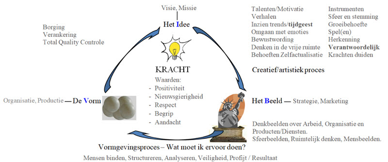 Graag geef ik nog extra betekenis aan moed door te verwijzen naar mijn boek De Glunderende Organisatie (2016). ‘Juist de KRACHT in het individu maakt het mogelijk zijn vermogen te activeren’. Als een essentie van het onderstaande IBV-paradigma zijn bindende krachten in een organisatie en maatschappij onderhevig aan ondersteunende waarden. Ik stel dat een Creatief/artistiek proces ook voor de bevordering van integriteitsbeleving een stimulans is. Je treft enkele elementen van dat proces. Het Idee (de gedachte) over iets (in ons geval integriteit) zal moeten overeenstemmen met de Vorm. De genoemde waarden hebben daarvoor een verfijnend en richtinggevend effect op het bewustwordingsproces.