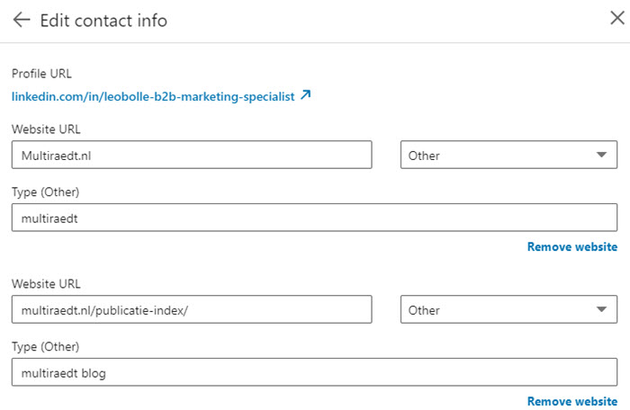 Daar kun je de url aanpassen. Die van mij ziet er zo uit: https://www.linkedin.com/in/leobolle-b2b-marketing-specialist/ Denk erom, dat verandering van een bestaande url, de links die je hebt gebruikt om naar je LinkedIn-profiel te verwijzen, niet meer werken. Pas die links dan aan m.b.v. de nieuwe url.