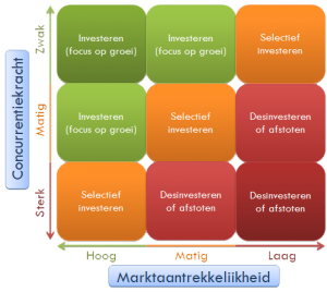 Dit model van de firma General Electric is een verbetering ten opzichte van de eerder ontwikkelde BCG matrix. Dat is het bekende model met de cashcows en de dogs. Ook nog steeds een leuk model om in te vullen.