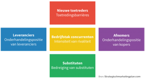 Marketinggoeroe Michael Porter ontwikkelde dit model waarmee je gestructureerd je concurrentiekracht inzichtelijk kunt maken. Dat doe je door de volgende 5 vragen te beantwoorden.
