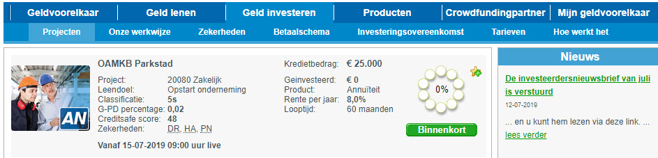 Financieren via crowdfunding groeit als kool. Zo is ons eigen crowdfundingplatform, Geldvoorelkaar.nl, het eerste halfjaar van 2019 met 158% gegroeid ten opzichte van het eerste halfjaar van 2018. Daarmee is Geldvoorelkaar.nl vele malen sterker gegroeid dan de andere Nederlandse crowdfundingplatforms, die over deze periode een gemiddelde groei van 38% lieten zien. Die groeit komt onder meer door projecten zoals hieronder is afgebeeld: