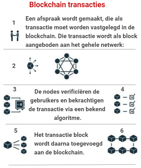 - Het hiernaast geschetste eenvoudige schema van een blockchain transactie is op zich niet al te gecompliceerd. De grootte van een blockchain en complexiteit van de noodzakelijke berekeningen kosten echter tijd. Er is bovendien veel computer power (elektriciteit) nodig om transacties te verwerken. De snelheid ligt nu nog te laag om veel verkeer mogelijk te maken. Ook hier wordt hard aan gewerkt en flink geïnvesteerd in betere oplossingen.