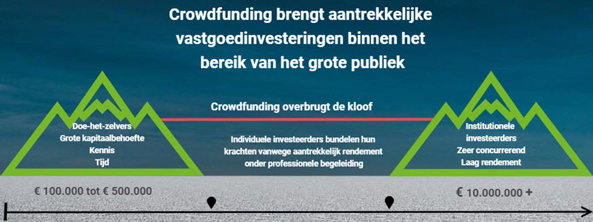- Laagdrempelig: het succes van de crowdfunding platforms kan niet alleen verklaard worden uit het wegnemen van kopzorgen. Zij zijn een zeer belangrijke schakel gebleken bij het openen van een vastgoedmarkt, die voorheen onbereikbaar was voor kleinere investeerders. De platforms trekken een breed publiek aan voor een groot assortiment van projecten. Zowel de kleine als de grote projecten zoals winkelcentra en kantoorgebouwen komen aan bod.