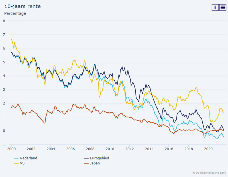 De onderstaande rentegrafiek van de Nederlandse Bank laat zien hoe de rente op staatsobligaties zich de laatste 20 jaar heeft ontwikkeld. Inmiddels is die rente negatief! (- 0,48%) Dat betekent dat je nu geld moet meebrengen wanneer je de overheid geld leent. Verdisconteer je daarbij ook nog de inflatie, dan neemt je in staatsobligaties belegde vermogen met bijna 3% per jaar af. Update per 2-11-2022: inmiddels is die rente opgelopen naar bijna 2,5%. De inflatie ligt echter extreem hoog momenteel (16,8% in de afgelopen maand). Hopelijk is dit tijdelijk als gevolg van onder meer de energiecrisis en leveringsproblemen vanwege Chinese lockdowns.