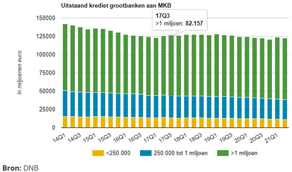 Gedurende de periode 2014-2021 is de totale kredietverlening aan het MKB afgenomen van € 92 miljard naar € 84 miljard. Sterkste daling vond plaats onder financieringen kleiner dan € 1 miljoen. (rekening houdend met de groei van de economie en inflatie, dan is de daling nog groter)