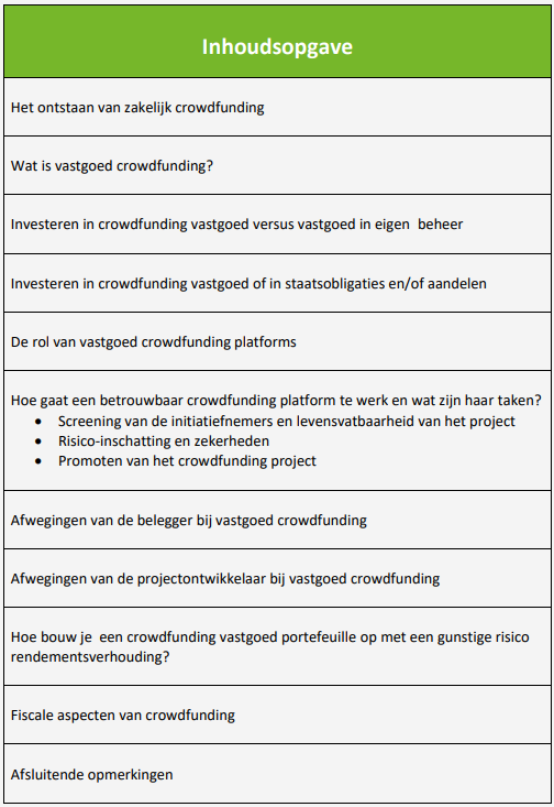 Vastgoed crowdfunding wordt steeds populairder en is daarom steeds vaker in het nieuws. Voor veel mensen is het echter nog een onbekend fenomeen, waar zij best wel wat meer over zouden willen weten. Wat is vastgoed crowdfunding nu precies? Hoe werkt het? Welk platform kan ik gebruiken en waar moet ik allemaal op letten? Voor al die mensen die graag in vastgoed crowdfunding zouden willen investeren of hun vastgoedproject zouden willen financieren, maar die graag eerst nog goed geïnformeerd willen worden, is deze gids geschreven.