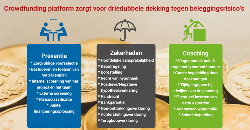 Als crowdfunding platform doen wij er alles aan om het risico voor de belegger te minimaliseren. Daarvoor nemen wij allereerst preventieve maatregelen zoals een grondige kredietbeoordeling. Daaronder valt onder meer een uitgebreid antecedentenonderzoek en een analyse van het businessplan inclusief jaarcijfers en prognoses. Indien wij overtuigd zijn van de levensvatbaarheid van het project, dan bepalen wij welke financieringsoplossing het meest geschikt is. Vervolgens zorgen wij ervoor dat er voldoende dekking is (bv borg, hypotheek, pand), welke passend zijn bij het risicoprofiel.