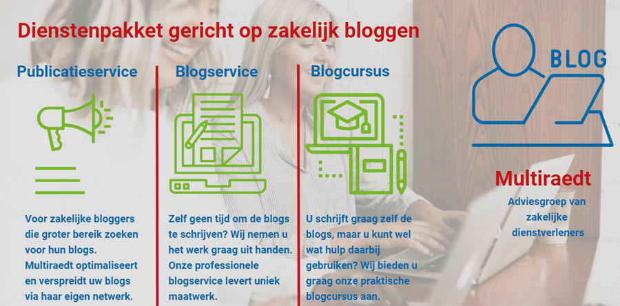 In 2013 is Multiraedt gestart met een publicatieservice voor zakelijke dienstverleners. Die service bestaat uit het verspreiden van hun zakelijke boodschap over het uitgebreide Multiraedt-netwerk. Het bedenken en schrijven van deze boodschap doen de dienstverleners in principe zelf. Indien gewenst kunnen wij daarbij helpen. Dat kan onder meer door het volgen van onze uitgebreide blogcursus.
