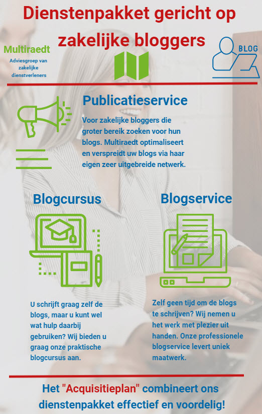 Bent u een vakspecialist met een gedegen achtergrond en veel ervaring, dan kunt u zich ook aansluiten bij het klantwervingscollectief Multiraedt. De aangesloten leden dragen aan dit collectief bij door te publiceren op hun vakgebied. Daarmee trekken zij extra lezers aan voor zichzelf én voor het collectief. Zo zorgen de gezamenlijke inspanningen voor een enorme hefboom, waar iedereen van profiteert. Bloggen blijkt een zeer klantvriendelijke manier te zijn om in contact te komen met (potentiële) klanten.
